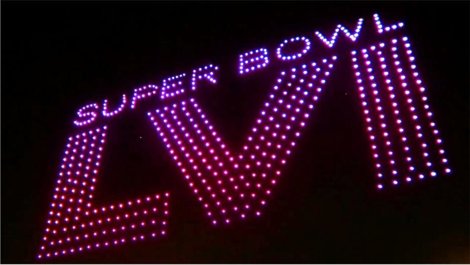 Drone Formation Highlights: Super Bowl trophy, animated football catch with player, team logos, Hollywood iconography